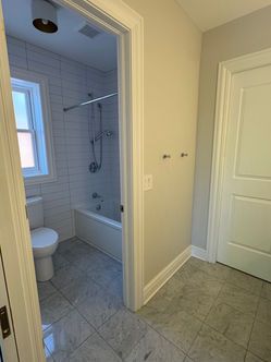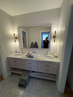 We layered in Calacatta Viola flooring and detailed wainscoting trim for texture and depth—the veining brings movement, and the trim adds structure. It’s that push and pull we’re always chasing: graphic and soft, playful and composed. Even the smaller moments—hardware, lighting, and paint transitions—were considered as part of that balance, each element reinforcing the overall rhythm of the room without overwhelming it.